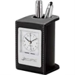 Liven up your employees and customers' desks with this useful item! The Alba desk clock and pen cup is one product that will give your brand a boost in exposure. The 3.25" x 4.25" x 2.75" desktop alarm clock is designed with a leatherette finish with white contrast stitching. It features an analog clock with a 1 3/4" face, quartz movement, and an alarm function. It also includes a convenient pen and utensils holder. Add a custom imprint of your company, organization, or club's name, logo, and/or organizational message to the holder. Allow this useful item to get you the attention you deserve!