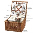 The quality and sophistication of the English-style Cheshire willow picnic basket for two is sure to impress recipients! Beautifully hand crafted using full reed willow, each basket includes ceramic plates, glass wine glasses and the highest quality accessories. It includes two ceramic plates, glass wine glasses, stainless flatware and cotton napkins and one food cooler, insulated wine pouch, hardwood cutting board, spill-proof salt and pepper shakers and a wood handle cheese knife. Available plate and napkin patterns include Gazebo, London or Santa Cruz. Blanket and coffee service options are also available.