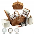 The Huntsman Willow Picnic Basket has a traditional style that's sure to capture the attention of your target audience! Hand crafted using full reed willow, this generously sized basket is made to last. Easy to pack, carry and enjoy, it includes quality components including ceramic plates and glass wine glasses. It includes four ceramic plates, glass wine glasses, stainless flatware and cotton napkins and one food cooler, insulated wine pouch, hardwood cutting board, spill proof salt and pepper shakers and wood handle. Blanket and coffee service are also available. Leave a lasting impression on recipients!