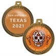Stock 3" Die Cast Medal with 3-dimensional wreath & star design. Includes full color poly dome imprint on 1 side. Choice of antique brass (gold tone), antique nickel or antique copper finish. Optional stock 7/8" neck ribbon with quick release clip available. Low 50 piece minimum order Fast 6 working day production standard, rush service available.. Includes two-sided full color poly dome imprint