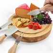 Ensure that your business reaches its target audience with this Wooden Cheese Board and Knife Set. Swivel-style circular bamboo chopping board with large 9 1/2" diameter cutting surface. Includes a hard cheese knife, cheese shaver, cheese fork, cheese spreader. All tools conveniently stored in the slide-open case. Inherently anti-microbial. Easy to clean. NOTE: Due to the natural characteristic of wood, the grain and the wood type, laser engraving will appear different on every piece. Engraving may appear lighter, darker or mixed tone on each of the pieces within a batch of order. Our serving platter warm up your guest appetites with fine Farmhouse Cheddar,Artisan Bread, or any alluring meal that you have prepared.