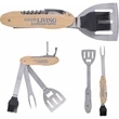 You'll proclaim yourself as King of the Grill with a gift or giveaway of this cool 5-in-1 barbecue tool! This 10 5/8 x 3 1/2 x 1 1/8 device is crafted from wood and stainless steel. Includes a barbecue fork, basting brush, bottle opener, corkscrew and detachable spatula -- everything you need to grill up something special. The fold-down action lets it clean up and store away easily. Natural tone. Add your school, sports team, organizational or company logo or message to customize.