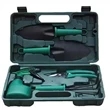 5pc garden tool set includes large trowel, small trowel, cultivator, water mister and pruner all packed in a rugged carrying case.