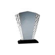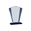 Premier Crystal is the optimal showcase for accomplishment. Premier Clear Accent Glass is individually boxed and mounted on a black glass base. This 8" fan accent glass award is laser engraved but can be sand etched for an additional charge. Imprint will appear in a frosted color on the glass. They are 3/8 inch thick. Each piece is handmade, so size may vary slightly. Bases are made of glass and come already attached to the award. Comes in clear or blue.