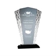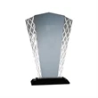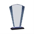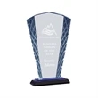 Premier Crystal is the optimal showcase for accomplishment. Premier Clear Accent Glass is individually boxed and mounted on a black glass base. This 9 1/2" fan accent glass award is laser engraved but can be sand etched for an additional charge. Imprint will appear in a frosted color on the glass. They are 3/8 inch thick. Each piece is handmade, so size may vary slightly. Bases are made of glass and come already attached to the award. Comes in clear or blue.