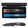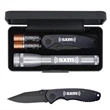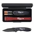 Impress potential clients with your hardware knowledge when you invest in this AA LED mini Mag-Lite ® with Warhawk pocket knife. This powerful flashlight measures 6 1/2" and includes a Warhawk pocket knife with a 4" handle and 3" blade. This functional knife is finished with gorgeous black stainless steel giving the recipient the ultimate blade experience. This is an excellent stocking stuffer or holiday gift that anyone will enjoy. Your laser engraved graphics will look stunning on this unique promo. This item comes with two "AA" batteries and is packaged in a presentation box. Sharpen your brand's appearance with this handy tool.