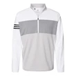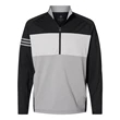 Adidas 3-Stripes Competition Quarter-Zip Pullover ul)9.9 oz./yd2, 88/12 recycled polyester/elastane. Colorblocked with 3-stripes branding on right arm sleeve. Quarter-zip mock collar. Two front pockets. Contrast adidas logo on back center neck. This product meets the following Sustainable Style subcategory:Sustainable Materials: contains 88% recycled polyester