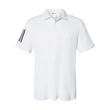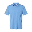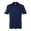 Adidas Floating 3-Stripes Polo ul)6.1 oz./yd2, 100% recycled polyester. True Blue Heather/ Grey Three is 88/12 polyester/elastane. Hydrophilic finish. Self-collar. Three-button placket. 3-stripes heat transfer on right sleeve. Open hem sleeve. UPF 50+ protection. Contrast adidas logo on back neck. This product meets the following Sustainable Style subcategory:Sustainable Materials: contains 100% recycled polyester