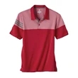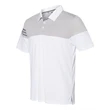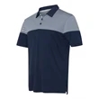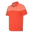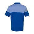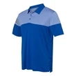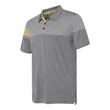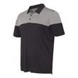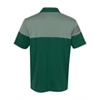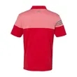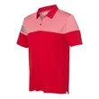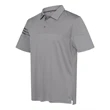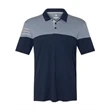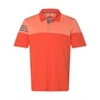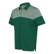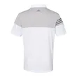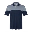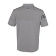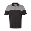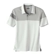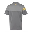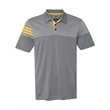 Adidas Heathered 3-Stripes Colorblocked Polo ul)3.8 oz./yd2 (US), 6.4 oz./L yd (CA), 100% recycled polyester. Moisture management properties. Self-fabric collar with three button placket. Contrast 3-stripes screen print on right sleeve. Heather colorblock on upper chest, back and shoulders. Contrast adidas® logo at back neck to match 3 stripes on sleeve. UPF 30+ protection. To our Canadian customers: Please note adidas products cannot be exported internationally. Consult our Terms and Conditions section for more information.