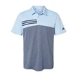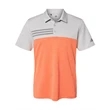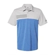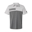 Adidas Heathered Colorblocked 3-Stripes Polo ul)6.7 oz./yd2, 100%% recycled polyester. Hydrophilic finish. Self-collar with three-button placket. Bold 3-stripes print on right chest. Open hem sleeve. UPF 50+ protection. Back is solid. adidas logo on left sleeve. This product meets the following Sustainable Style subcategory:Sustainable Materials: contains 100% recycled polyester