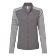 Adidas Women's 3-Stripes Full-Zip Jacket ul)7.2 oz./yd2 (US), 12 oz/L yd (CA), 94/6 recycled polyester/elastane plain weave. Durable water-repellent finish. Soft shell stretch fabric. Half elastic cuffs. Two front zip pockets. 3-stripes on right arm. Contrast color adidas performance logo on right hip. This product meets the following Sustainable Style subcategory:Sustainable Materials: contains 94% recycled polyesterTo our Canadian customers: Please note adidas products cannot be exported internationally. Consult our Terms and Conditions section for more information.