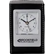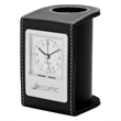 Liven up your employees and customers' desks with this useful item! The Alba desk clock and pen cup is one product that will give your brand a boost in exposure. The 3.25" x 4.25" x 2.75" desktop alarm clock is designed with a leatherette finish with white contrast stitching. It features an analog clock with a 1 3/4" face, quartz movement, and an alarm function. It also includes a convenient pen and utensils holder. Add a custom imprint of your company, organization, or club's name, logo, and/or organizational message to the holder. Allow this useful item to get you the attention you deserve!