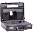 Attache Case. Made of vegan leather with polyester trims. Multi-use built-in organizer pockets. Padded laptop section - fits most 17.3". Reinforced handle. Dual combination locks. Removable cable pouch. Adjustable divider pocket.