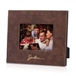 Dappling chocolate brown faux leather is finished in a elegant lizard pattern and stretched across the top of this frame, surrounded by a black velvet case.