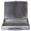 Attache: size 12.2" x 9.25" x 2". Stylish metal, hinged Attache tin with single clasp and grey polypropylene handle. Imprint method is 4 color process or silk screen. IN STOCK