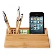 Bamboo desktop organizer. Holds writing instruments, smartphones, business cards, etc. (accessories not included). Bamboo is a natural fiber, therefore noticeable shade variations and grain patterns may be apparent within orders of the same item. Due to our high standards of quality control, we must advise that slight irregularities in the bamboo of this item may result in imprint imperfections but are consistent with the natural look of the product.