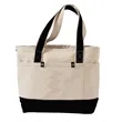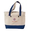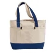 An expansive main section, three front pockets, and three back pockets take this bag to the beach and beyond! Heavy cotton canvas construction is soft and durable. 14 inch drop handles are accented to match the base for a nautical look.