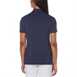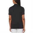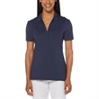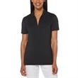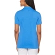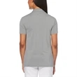 4.7 oz., 92% polyester/ 8% spandex blend jersey knit fabric. Opti-Dri technology transfers moisture away from the body to keep you cool and dry. UV Repel technology keeps skin safe from the sun's harmful rays UPF 50. Stretch fabric moves with you to increase your range of motion. Self-fabric collar. Open placket. Feminine ruching shoulder detail. Double needle hemmed bottom with side vents. Heat seal label provides tag-free comfort. Tonal embroidered Callaway logo on back neck. Blank product.