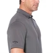 5.2 oz., 92% Polyester/ 8% Spandex yarn-dyed knit jersey stripe. Opti-Dri technology transfers moisture away from the body to keep you cool and dry. Stretch to give full range of motion. UV Repel technology keeps skin safe from the sun's harmful rays UPF 30+. Self-fabric collar with edge stitch. Double needle hemmed bottom with side vents. 3-button placket with top and bottom placket edgestitch with Callaway embossed buttons. Heat seal label provides tag-free comfort. Contrast embroidered Callaway logo on right sleeve. Blank product.
