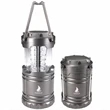 Light up your campsite, work area or barbecue table with this small but bright camping lantern. This 3.375" x 4.875" lantern is made of durable polystyrene plastic with pull-up arms to activate the light and provide handles for easy mounting. 30 bright LED bulbs provide a brilliant 360 degrees of illumination with just the two included AA batteries. Bold gunmetal finish. Add your school, sports team, organizational or company logo or message to customize.