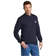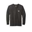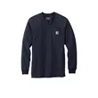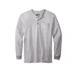 Carhartt Long Sleeve Henley T-Shirt This henley is made of heavyweight cotton jersey and cut generously for a roomy fit. Durable 6.75-ounce, 100% cotton jersey knit 90/10 cotton/polyester jersey knit (Heather Grey) 60/40 cotton/polyester jersey knit (Carbon Heather) Rib knit crewneck Henley collar with three-button front Tagless neck label Left chest pocket Side-seam construction minimizes twisting Carhartt label sewn on left chest pocket Rib knit cuffs Loose fit