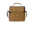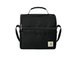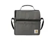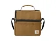 Carhartt Lunch 6-Can Cooler. Whether you want your leftovers to stay warm 'til lunch or that six-pack to stay cool 'til clock-out, this seam-sealed, insulated cooler is up to the task. A separate top compartment helps you avoid crushed sandwiches and chips. 600D rugged polyester Rain Defender durable water repellent (DWR) Seam-sealed to prevent ice from leaking as it melts Insulated top compartment to separate food Fully insulated main compartment can hold up to six 12-ounce cans Front slash pocket Shoulder strap and top handle Carhartt label sewn on front Capacity: 11L Dimensions: 9"h x 10"w x 7"l; Approx. 671 cubic inches Note: Bags not intended for use by children 12 and under.