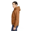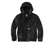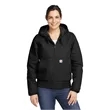 Carhartt Women's Washed Duck Active Jac. This ladies version is an update to a Carhartt icon-the WJ130. Tough on the outside and warm on the inside, it's also sanded and brushed for softness. 12-ounce, 100% ring spun cotton washed duck Quilted nylon lining for easy on and off; 80-gram, 100% polyester 3M Thinsulate featherless insulation for warmth without the weight Attached quilted-flannel-lined three-piece hood with drawcord closure Full-length brass front zipper Two interior pockets: one zippered, one hook and loop Two large hand pockets Pen stall in right pocket Locker loop Elbow pleats for ease of movement Rib knit cuffs and waistband Carhartt-strong, triple-stitched main seams Carhartt label sewn on left pocket Loose fit