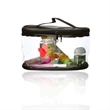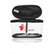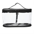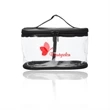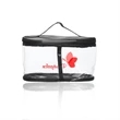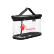 This cosmetic travel bag is the perfect size for a vacation across the country or a weekend getaway! Bound to fit into your suitcase or backpack, each bag measures 8.5' x 4.5", is made of clear PVC and can be customized with a brand name, logo or message of your choosing. Features include a black leather bottom with black leather top cover, sewn handle on top and a top cover with two black zipper head closure. The ideal choice for beauty supplies or other small materials when traveling or for home storage.