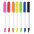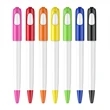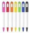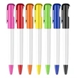 A plastic, click-action ballpoint pen with white body and colored cap-like top with curved clip that matches the tip. Your design can be printed on the barrel, on the clip, on the side portion beside the clip and even on the hole at the top. With free 1 color pad printing. Body color can also be customized for an extra charge and with minimum order required. Standard writing Ink color: Black Price Includes: Free setup Free 1 color imprint on 1 side Free virtual proof Free logo PMS matching Free standard shipping to 1 US location