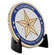 Die cast desktop coin stand holds custom medals and coins, perfect for two-sided display. Allows coins to be easily removed and replaced. Available in black finish. Other finishes available, quoted upon request. Safely holds most challenge coins and medals up to 2". Custom coin not included. Coin packaging and presentation products sold exclusively with coin orders. Check with factory for availability.