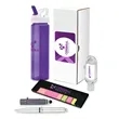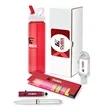Here's a wonderful way to welcome new employees or clientele to your business. Show off the awesomeness of your brand with the Commend 4-piece welcome gift set. The 2.75" x 10.5" x 2.75" boxed set includes a 25 oz., USA-made PET water bottle that's designed with a flip-up spout and an integrated carrying handle. The set also includes a 1 oz. bottle of hand sanitizer with a 50mm aluminum carabiner clip attachment and a desk set with two color memos, color flags, and a 4 1/2" ruler. A 3-in-1 ballpoint pen with a chrome barrel, stylus, and an LED light completes the set. Customize the items with your company, organization, school, or club's name, logo, and/or slogan. Make a great impression to your brand with this gift set! Ground shipment only.