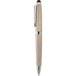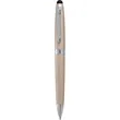 Exclusive Cutter & Buck® design. Matte gold powder finish with shiny chrome accents. Twist action mechanism. Soft, rubber capacitive stylus for touch screen devices. Subtle branding on middle ring and pen clip. Includes premium black ink ballpoint cartridge. Includes 2-piece Cutter & Buck® gift box.