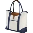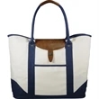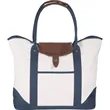 This oversized carry-all tote is great for travel or even the beach. Open main compartment features a leather flap with turnlock closure. 8" handle drop height with leather comfort wrap. Made of rugged 21oz cotton canvas and lined with Cutter & Buck® sleek, striped signature lining. Antique nickel hardware and Cutter & Buck® branding help complete this piece.