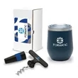 Toast your customers, supporters and event attendees with this wine themed two-piece thank you gift set. It's the perfect souvenir for seminars, trade shows, office visitors, conventions, or door prizes for grand opening activities and other marketing events. This unique set features a 12 ounce double-wall stainless steel vacuum insulated stemless wine cup with a clear lid and a 2-in-1 combination steel corkscrew and bottle stopper with silicone accents. Add your organizational or company logo or message to the cup and corkscrew to customize. Each set comes in a 3.25" x 4.75" x 3.25" full color gift box.