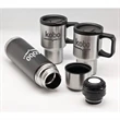 Deluxe three piece drinkware set. 3-pc drinkware set includes a 24 oz vacuum bottle with push and pour mechanism and two 14 oz stainless steel mugs. Packaged in a black two-piece deluxe gift box. BPA free. Gift Box size: 15 1/2" h x 10 3/4" w x 3 1/2" diameter. Bottle size: 11 1/4" h x 3 1/4" diameter. Mugs size: 6" h x 3 1/2" diameter.