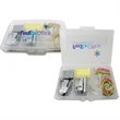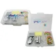 This 7 piece, essential office kit includes a mini stapler, staples, tape, paper punch, paper clips, sticky note pad and rubber bands. Imprint your company name or logo on the lid of the clear acrylic box and use this stationary set to promote a new charter school, bank branch opening, specialist office, distribution company and more!