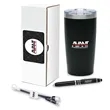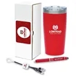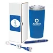 There's no better way to welcome new employees or customers to your business than with this set! The Embrace 3-piece welcome gift set is the warm welcome you're looking for to make your business even more captivating. The set includes a stainless steel 18 oz. tumbler with a double-wall design and a polypropylene inner liner with a twist-off lid and a colored flip closure. It also includes a 3-in-1 charging cable set with dual micro/5-pin lightening and type-C connectors in a case that has an integrated phone stand and carabiner. The set also comes with a ballpoint pen with an aluminum body, capacitive stylus, LED light, and chrome accents. Customize the items with your company, organization, or school's name. logo, and/or slogan.