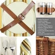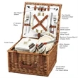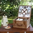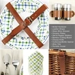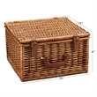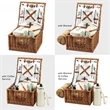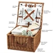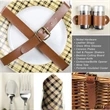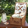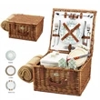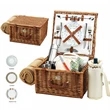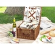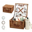 The quality and sophistication of the English-style Cheshire willow picnic basket for two is sure to impress recipients! Beautifully hand crafted using full reed willow, each basket includes ceramic plates, glass wine glasses and the highest quality accessories. It includes two ceramic plates, glass wine glasses, stainless flatware and cotton napkins and one food cooler, insulated wine pouch, hardwood cutting board, spill-proof salt and pepper shakers and a wood handle cheese knife. Available plate and napkin patterns include Gazebo, London or Santa Cruz. Blanket and coffee service options are also available.