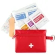 Be ready to tangle with everyday cuts and scrapes with the help of this perfectly portable 22-piece First Aid kit. This 5 3/4" x 3" polyester pouch has a zippered closure and a strapped split ring to attach to a keyring, purse or backpack. Inside are 15 adhesive bandages, one antiseptic and one moist towelette, a soap wipe and four alcohol preparation pads. The red design features standard First Aid cross insignia on one side - and is ready for your organizational or company logo, emblem or message on the reverse. Great for health shows and expos or as a general giveaway at business or social events.