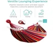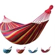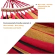 Enjoy comfort and relaxation wherever you go with this travel-friendly hammock! This folding travel-friendly canvas hammock with wooden stick is made of constructed of tightly woven colorfast cotton. It takes seconds to set up the hammock. Comes with 2 wide straps with steel rings at one end, you can attach the hammock to a hammock stand or hang it to two trees. The size is 75"x59", super lightweight and can be folded into the small attached sack, portable to carry and fits into backpack. 75" L x 59" W