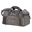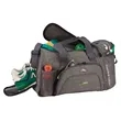 Large main compartment with U-shaped opening. End media pocket with headphone port. Mesh wet compartment rolls up when not in use. Zippered front pocket. Elastic shock cord and large clip for attaching extra gear. Adjustable shoulder strap. Includes lifetime warranty.