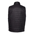 Independent Trading Co. Puffer Vest ul)100% nylon, exterior shell. 100% polyester lining, 60 gm Hyper-Loft poly fill insulation. Water & wind resistant . Reverse coil zippers at chest and pockets. Packable into chest pocket with reverse coil zipper . Capped elastic armhole binding. Locker loop at wearers back neck. Plastic cinche toggle at wearers right side waist. Chest pocket for concealed embroidery access. Tear away label.