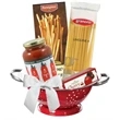 Impress guests with an Italian dinner wrapped in this reusable red colander filled with Imported Italian Pasta, Imported Italian sauce, along with breadsticks and Italian chocolates. Each Italian gift basket is carefully wrapped in clear cello and tied with festive bow for a gift presentation. Can ship bulk or drop ship to individual addresses. Other filler and packaging options available to fit your budget and event theme. Full color gift tag available, printed with your message and logo.