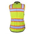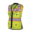 Kishigo Premium Black Series® Women's Heavy Duty Surveyors Vest Solid polyester front with mesh backHeavy duty black bottom to help keep a clean appearanceZipper front closure with reinforced durable webbing2'' wide high performance reflective material with 3'' contrastLeft chest mic tab and eyeglass loopAdjustable waist cinches to ensure a personalized fitPadded neck for comfort4'' slits at hip for mobilityLeft chest 2-tier pocket with dual function flap that can be held open with hook & loopRight chest gusseted pocket with retractable IDOutside lower front slash pockets with zipper closure, left and right lower front pockets and flaps and grommetsLower inside right pocket with zipper closureLower inside left tablet (iPad) pocket with load bearing strapHidden back pouch with left a...