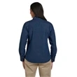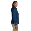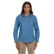 100% cotton denim;Flat-felled seams; Khaki double-needle topstitching; Signature twill tape at neck; Fully constructed front placket; Signature horn-style buttons with Harriton logo and contrast thread; Spread collar; Garment washed for extra softness; Subtle shade variances are a natural part of the washing process;