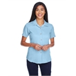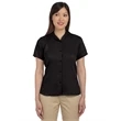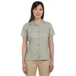 66% rayon, 34% polyester pieced bedford cord; Wrinkle-resistant;Full-button front; Synthetic coconut shell buttons; Replacement buttons; Self-fabric collar; Feminine fit with darts;