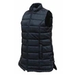 Ladies puffer vest. Outshell: 100% nylon, 2.0 ounce. 100% polyester, 1.65 ounce. Filler: 100% polyester, 5.0 ounce. Ladies thigh length vest with stand collar. 2 way zipper closure. Front and back princess. Seams with front zipper pockets. Side vents with tabs. Water resistant. Anti-bacterial. Anti-snag treatment.