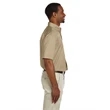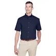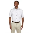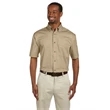 4.5 oz/yd2, 155 gsm; 55% cotton, 45% polyester twill; Wrinkle-resistant and stain-release fabric;Extra stitching at seams and buttons; Flat-felled seam finishing; Signature horn-style buttons with Harriton logo; Hemmed short-sleeves; Button-down collar; Left-chest pocket; Full back yoke and back pleat; Carbon neutral style in partnership with Green Story third party verified carbon offset program. For more information click on carbon neutral link above MSRP. ;