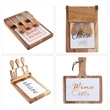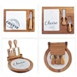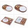 The wood swivel-style circular cheese board comes with assorted full-tang cheese tools.We have many different designs. Includes a cheese plane, knife/spreader, knife with prolonged tip, and a sharp cheese knife for hard cheeses, ready to slice up all your favorite cheeses. Features a rich and durable acacia wood board that opens to reveal the stainless steel tools inside. Recessed moat design along the board's edge will catch any liquid run off. Measuring in at 10.2" in diameter with the tools stored neatly inside, you never have to worry about misplacing a knife. The perfect size for your next picnic, wine tasting, or garden party. Customize it with an imprint of your company name, logo and more to associate your brand with a fun and unique product and make your next event more success