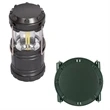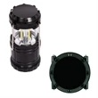 Mini camping lantern light. Made of ABS plastic. Features hidden extra bright COB light - pull up panel to reveal. Iron handles at top for carrying or hanging. Uses 3 AAA batteries (included and replaceable). Ships assembled with batteries shrink-wrapped inside device - this must be removed prior to use.